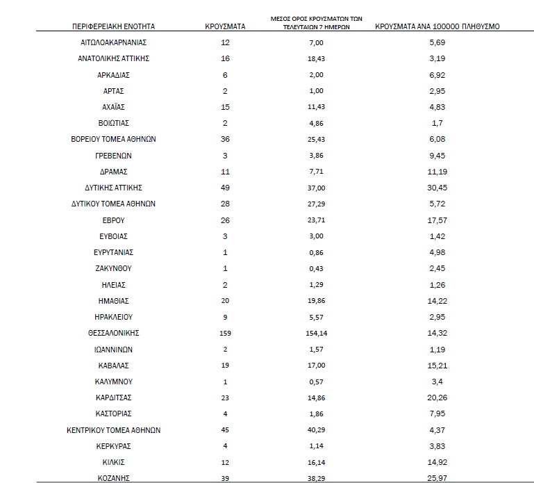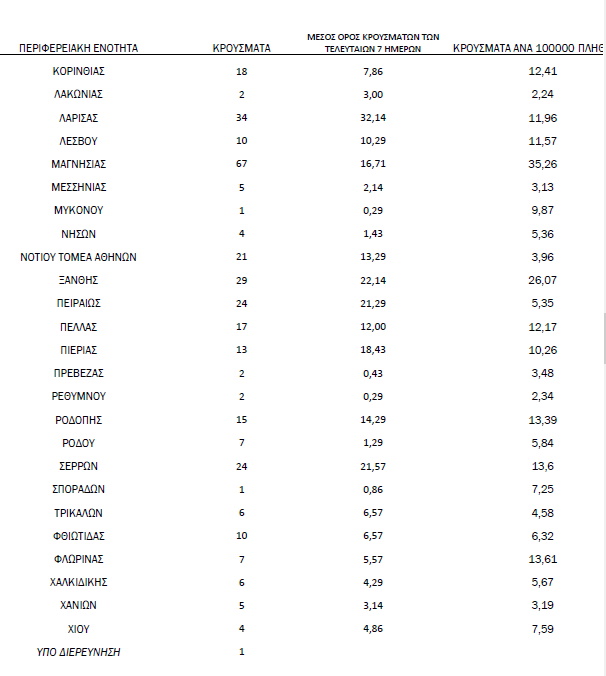Η κατανομή των 885 νέων εγχώριων κρουσμάτων ανά Περιφερειακή Ενότητα παρουσιάζεται στον παρακάτω πίνακα.
