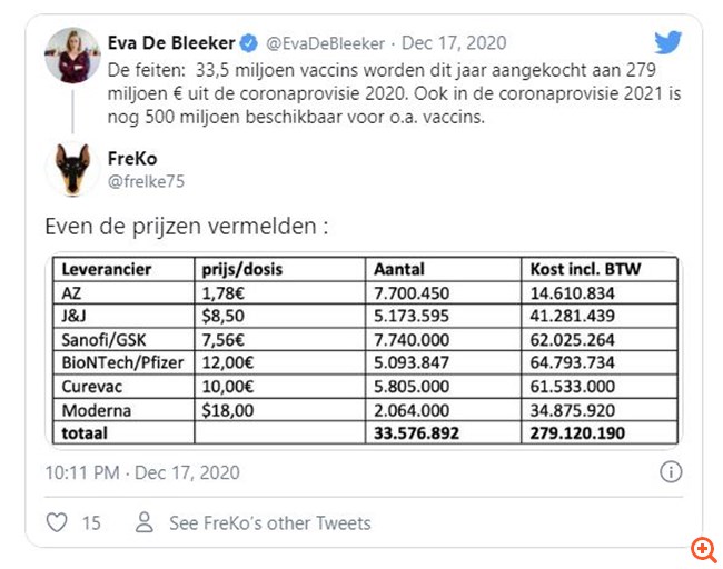 Την Παρασκευή στο Twitter της υπουργού δεν παρέμενε παρά αυτή η διαπίστωση : « ορίστε τα γεγονότα: 33,5 εκατομμύρια εμβόλια θα αγοραστούν αυτή τη χρονιά έναντι 279 εκατομμύρια euros ».