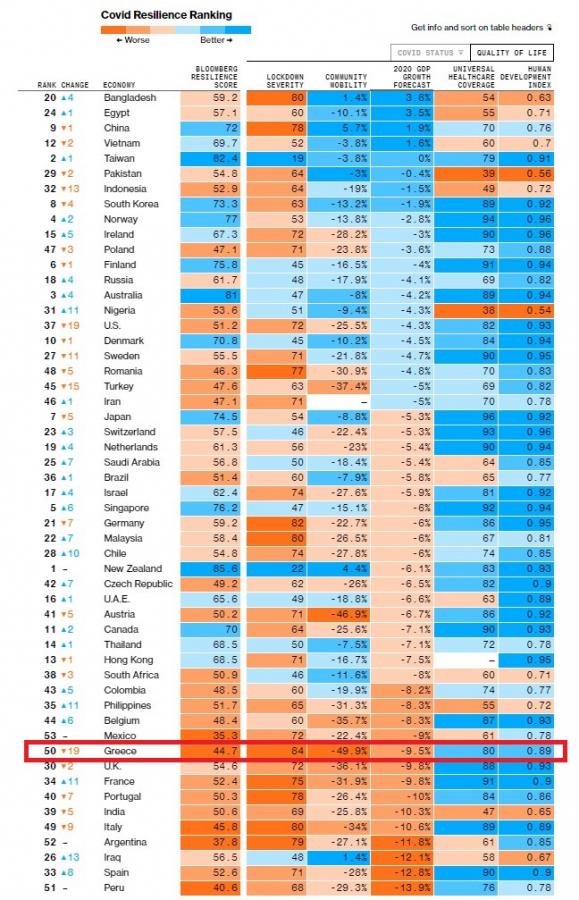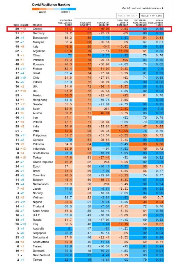 Η λίστα αξιολόγησης αντιμετώπισης του κορωνοϊού την οποία δημοσιεύει μηνιαίως το Bloomberg πρέπει να προβληματίζει την κυβέρνηση.