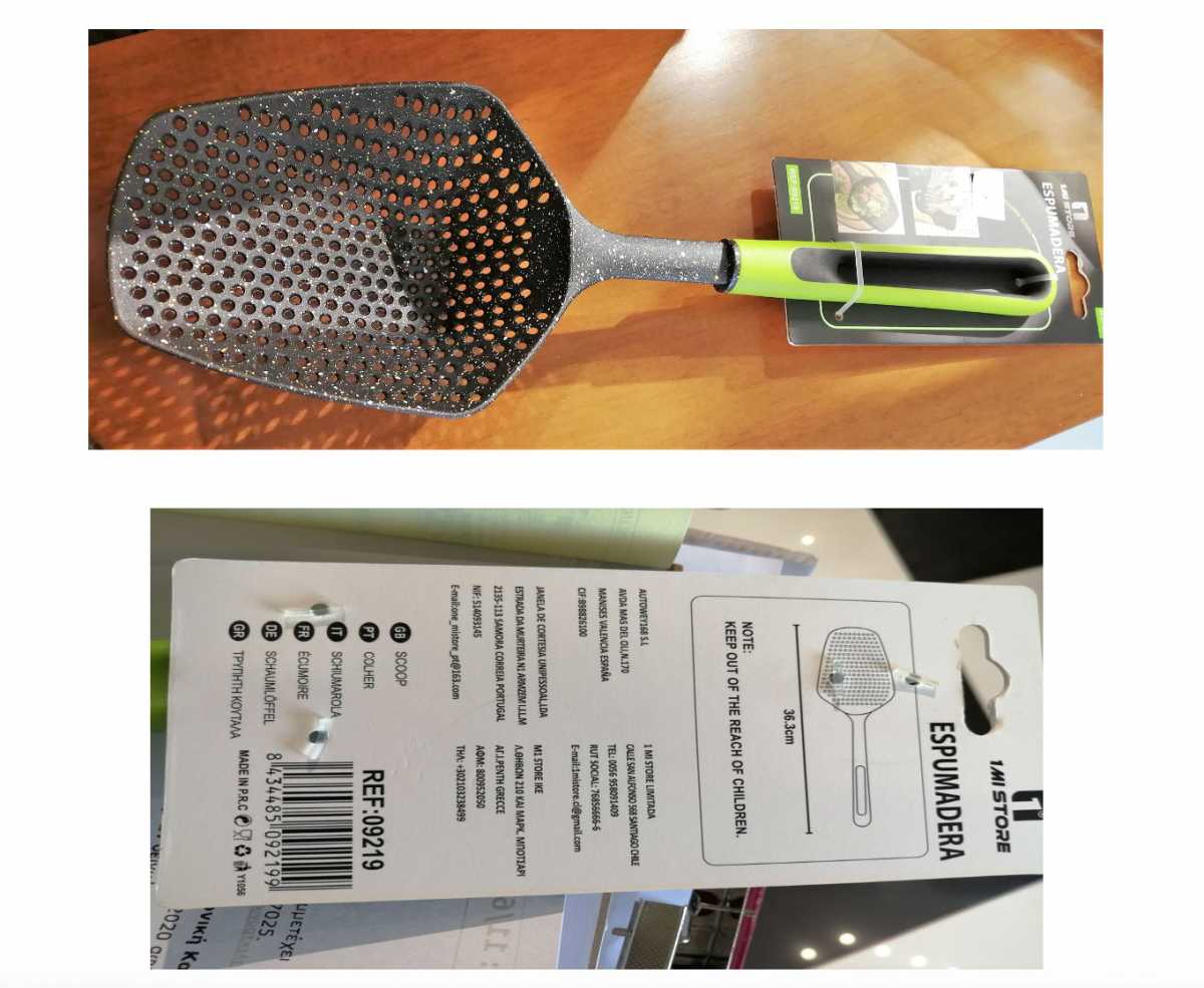 Πρόκειται για πλαστική κουτάλα μαύρου χρώματος με λευκά στίγματα και πράσινο χερούλι, με εμπορική ονομασία “Τρυπητή κουτάλα Espumadera 1 M1 Store (Ref. 09219) 36,3x12cm”, κινεζικής προέλευσης, και με αριθμό γραμμοκώδικα 8434485092199.