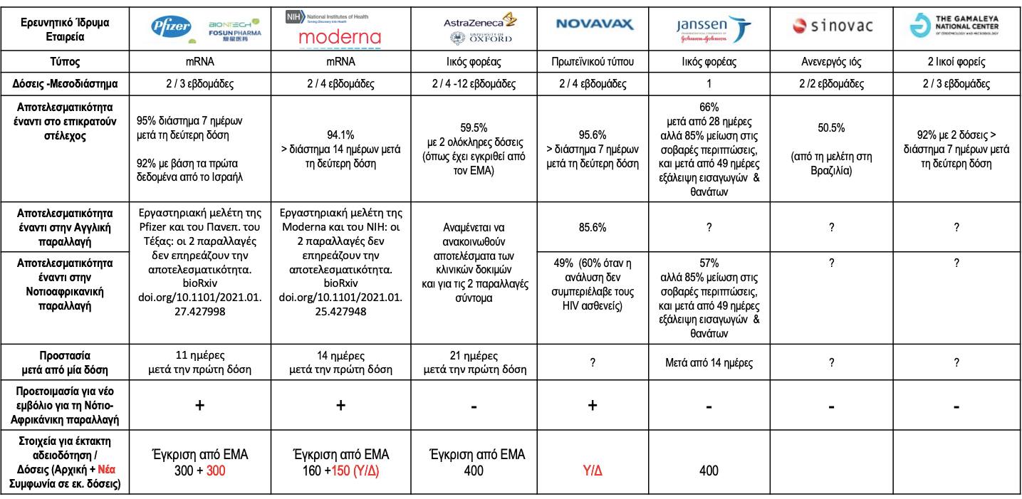 Ο κ. Μόσιαλος παρουσιάζει ένα πίνακα με απλή συγκριτική μελέτη των επτά εμβολίων και κάποια στοιχεία για την αποτελεσματικότητα στο επικρατούν στέλεχος και τις δύο σημαντικές παραλλαγές. «Αυτό που προέχει τώρα», όπως λέει, «είναι να αυξηθεί η παραγωγή και η διανομή των εμβολίων, καθώς και ο ρυθμός των εμβολιασμών. Μόνο έτσι θα λήξει η πανδημία».