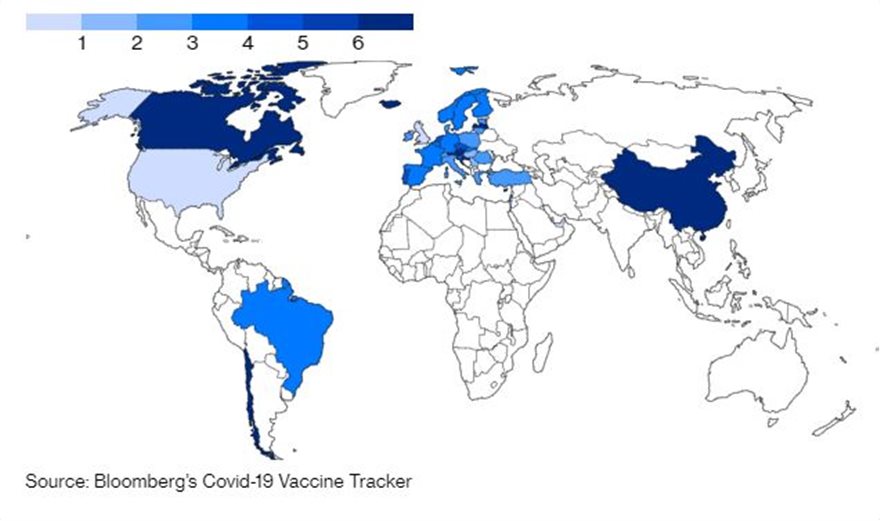 Σύμφωνα με τους υπολογισμούς του Bloomberg, υπάρχουν πάνω από 100 συμφωνίες για περισσότερες από 8,5 δισεκατομμύρια δόσεις των εμβολίων. Επίσης, μόνο το ένα τρίτο των χωρών έχει ξεκινήσει τις εκστρατείες εμβολιασμού.