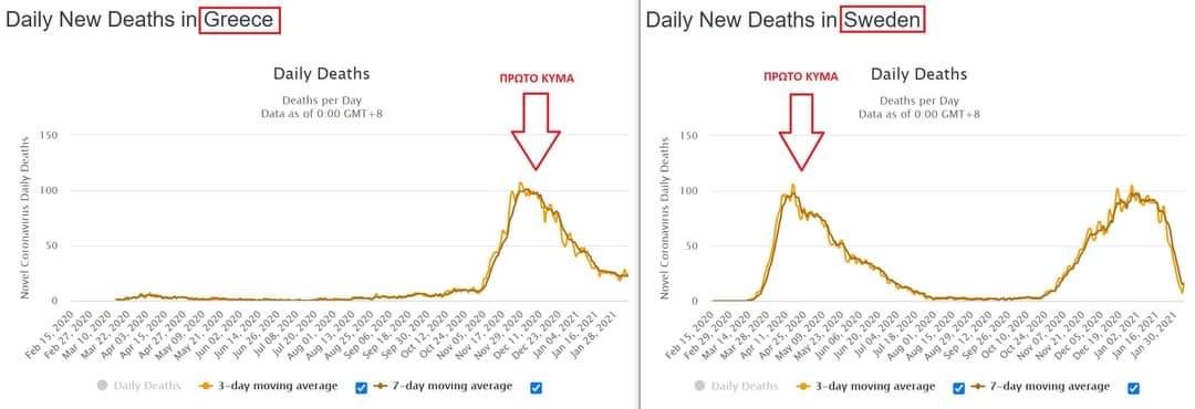 Αντίθετα η Σουηδία έχει ακολουθήσει από την αρχή της πανδημίας ένα πιο ελεύθερο τρόπο αντιμετώπισης της πανδημίας, που το πλήρωσε φαινομενικά μεν στο πρώτο κύμα, όμως στο δεύτερο δεν εντοπίζεται καμία σχεδόν διαφορά σε θανάτους από την Ελλάδα που ακολουθεί ένα από τα πιο αυστηρά lockdown στον κόσμο.