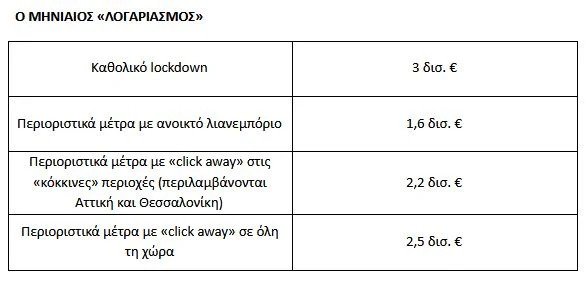 Την ίδια ώρα η χώρα μας αντιμετωπίζει ένα τεράστιο πρόβλημα και αυτό είναι η οικονομική καταστροφή από τα lockdown. Η ήδη πληγείσα από τα Μνημόνια ελληνική οικονομία βυθίζεται ολοένα και περισσότερο εξαιτίας των lockdown. Ενδεικτικά το κόστος του νέου lockdown μπορεί να φτάσει: