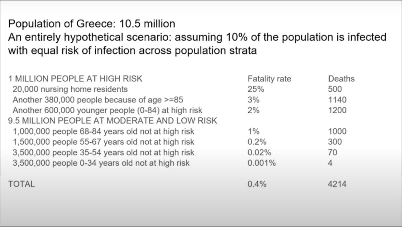 Όπως αναφέρεται στον παρακάτω πίνακα που δημοσίευσε ο κύριος Ιωαννίδης ένας τρόφιμος γηροκομείου εάν νοσήσει από κορωνοϊό έχει πιθανότητα 25% (!) να χάσει τη ζωή του. Καταλαβαίνει κανείς πως είναι αναγκαίο να παρθούν δηλαδή μέτρα για την προστασία του συγκεκριμένου πληθυσμού.