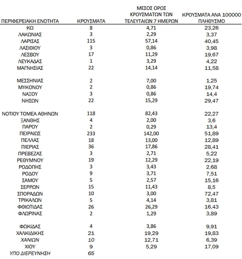 Με βάση τα επιβεβαιωμένα κρούσματα των τελευταίων 7 ημερών, 69 θεωρούνται σχετιζόμενα με ταξίδι από το εξωτερικό και 2.312 είναι σχετιζόμενα με ήδη γνωστό κρούσμα. To ?? για την επικράτεια εκτιμάται σε 1.06 (95%Crl: 0.43-1.81)