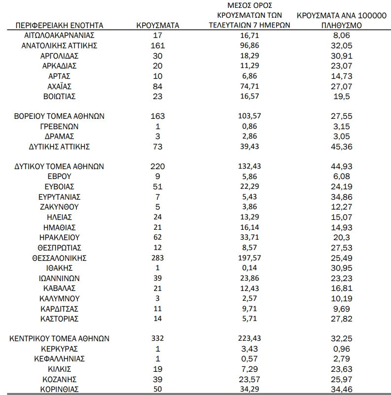 Με βάση τα επιβεβαιωμένα κρούσματα των τελευταίων 7 ημερών, 69 θεωρούνται σχετιζόμενα με ταξίδι από το εξωτερικό και 2.312 είναι σχετιζόμενα με ήδη γνωστό κρούσμα. To ?? για την επικράτεια εκτιμάται σε 1.06 (95%Crl: 0.43-1.81)
