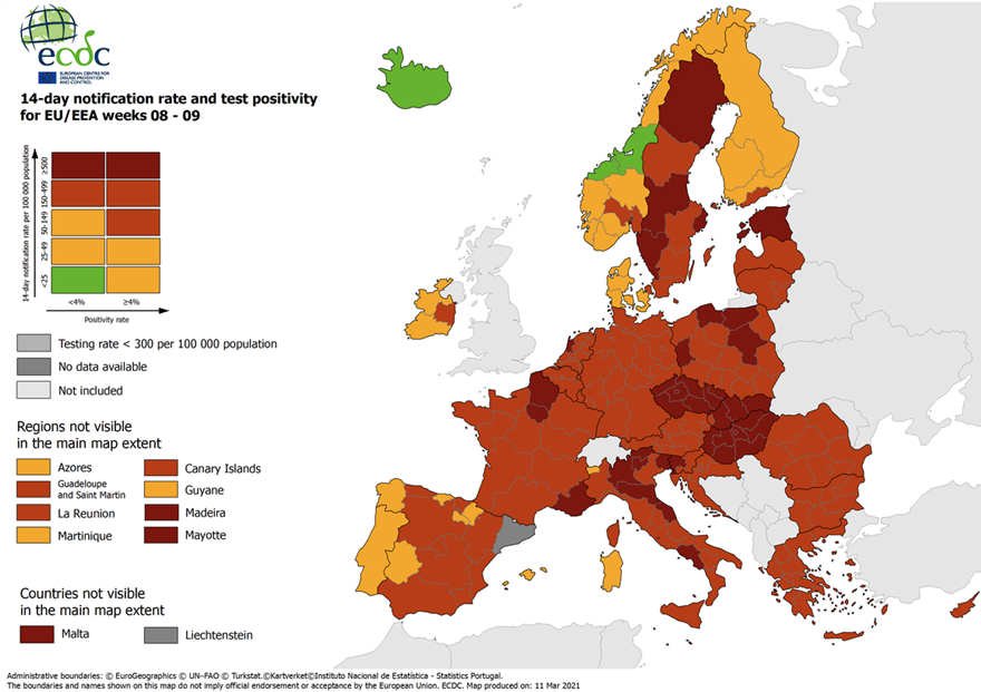 Ο συγκεκριμένος χάρτης συνδυάζει αριθμό τεστ, νέα κρούσματα και δείκτη θετικότητας για τις 14 ημέρες που προηγήθηκαν της 11ης Μαρτίου.
