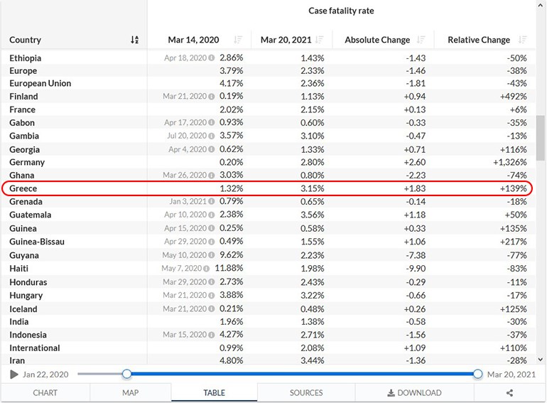 Η Ελλάδα στις 14 Μαρτίου 2020 είχε ποσοστό θνησιμότητας 1,32% ενώ ένα χρόνο αργότερα σκαρφάλωσε στο 3,15%, με το ποσοστό της αύξησης να αγγίζει σε σύνολο το +139%, όπως φαίνεται και στη φωτογραφία που ακολουθεί.