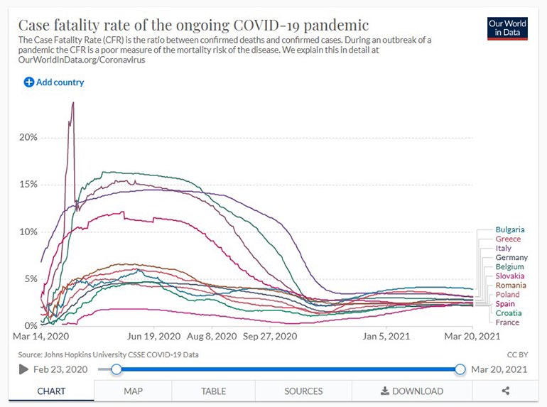 Σύμφωνα με τον παγκόσμιο χάρτη καταγραφής κρουσμάτων και θανάτων από κορωνοϊό όπως αναγράφονται στα δεδομένα του πανεπιστημίου Χόπκινς, η Ευρώπη μέσα σε ένα χρόνο μείωσε τα ποσοστά θνησιμότητας καθώς το Μάρτιο του 2020 ξεκίνησε με ποσοστό θνησιμότητας 3,79% ενώ ένα χρόνο μετά ο δείκτης δείχνει 2.33%, δηλαδή παρουσιάζει μείωση -38%.