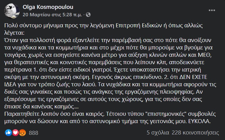 Η λοιμωξιολόγος, Όλγα Κοσμοπούλου μέσα από μία ανάρτησή της στα social media ζήτησε την παραίτηση των μελών της Επιτροπής Ειδικών, ενώ τους παρουσίασε τις ευθύνες τους για την αντιμετώπιση του κορωνοϊού.