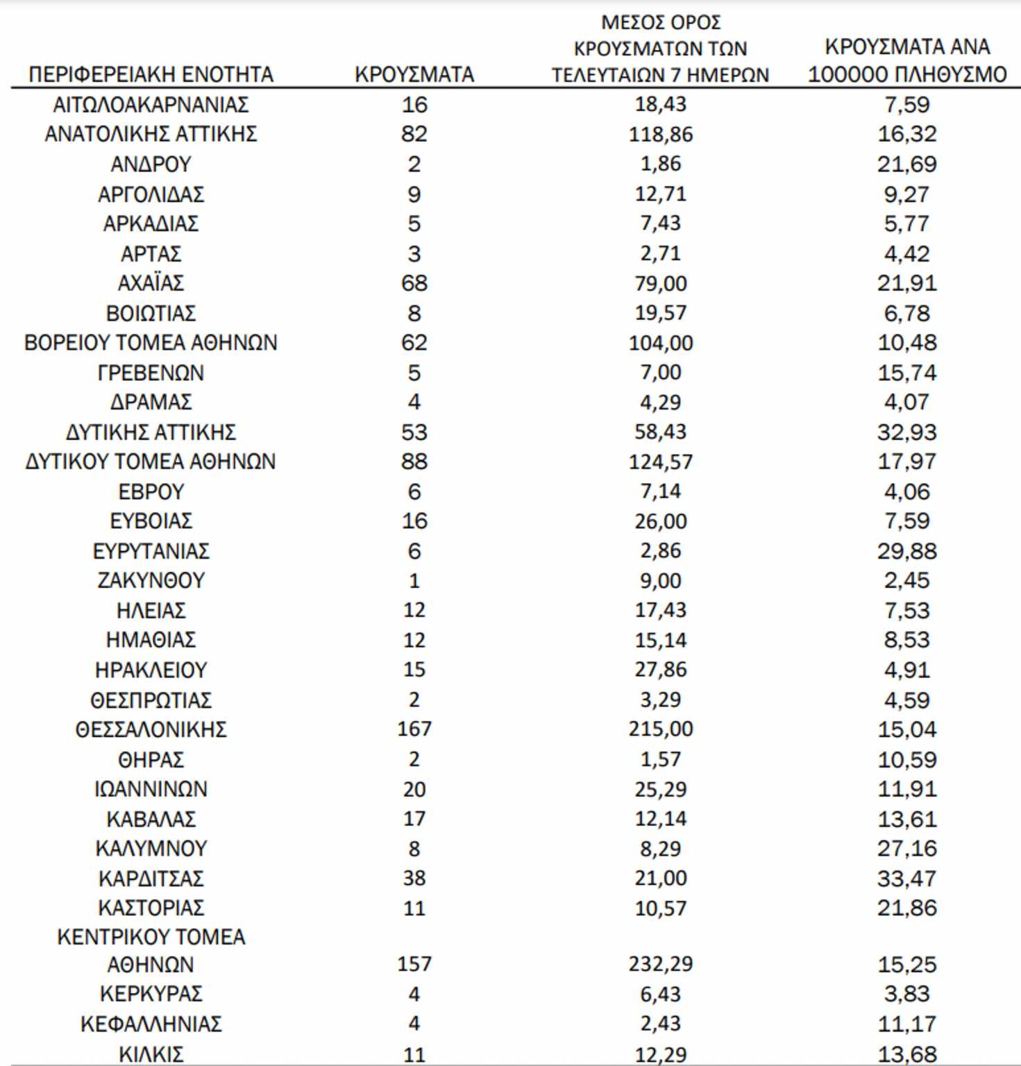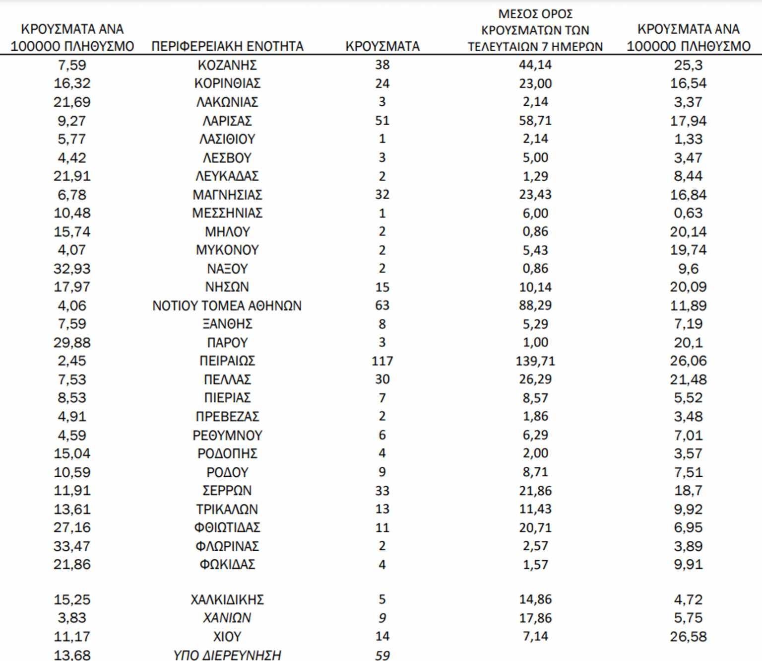 Την ίδια ώρα, 20 είναι συνολικά οι περιοχές στην χώρα που καταγράφουν διπλάσιο αριθμό νέων κρουσμάτων.