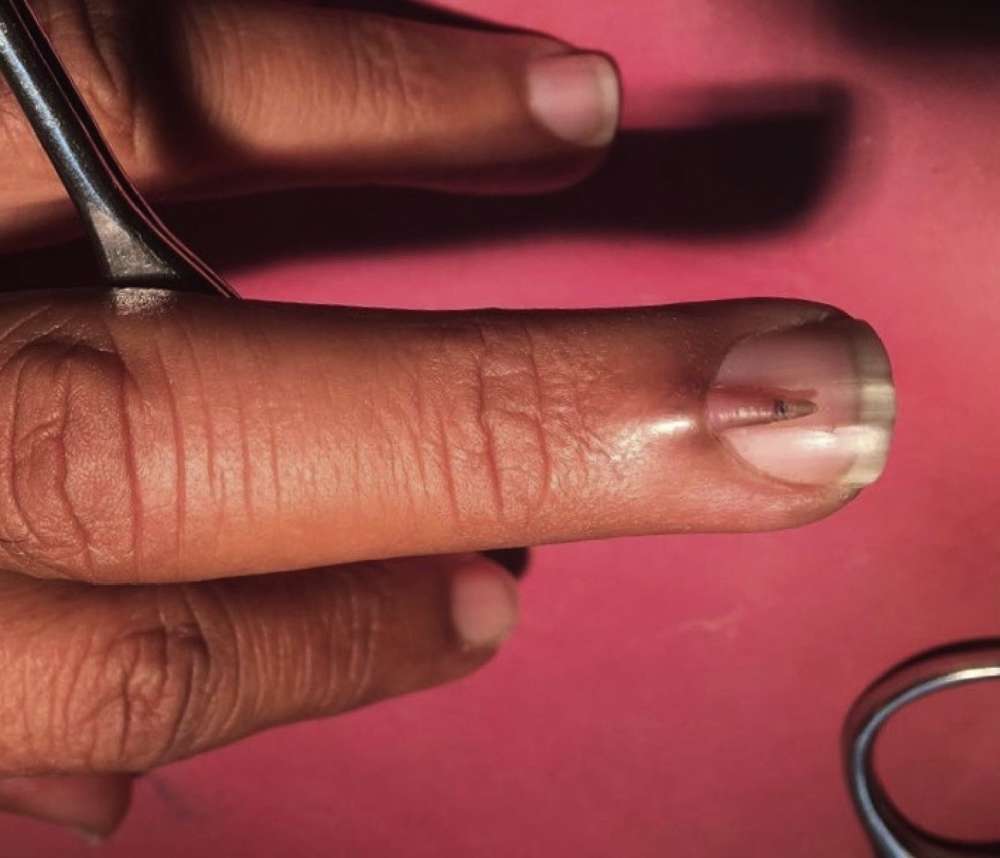 Η λύση για το προβληματικό νύχι του 28χρονου ήταν να αφαιρέσουν χειρουργικά το “κέρατο” από το υπόλοιπο νύχι (εικόνα παρακάτω). Αυτό έγινε με τοπική αναισθησία και το κέρατο βρέθηκε να έχει μήκος περίπου 1 εκατοστό.