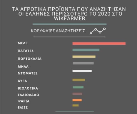 Τα δέκα πιο δημοφιλή αγροτικά προϊόντα που αναζήτησαν οι Έλληνες το 2020 παρουσίασε το Wikifarmer.