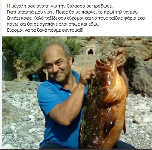 Ο 62χρονος αγαπούσε πολύ την θάλασσα και το ψάρεμα. Ο γιος του τον αποχαιρέτησε με ένα συγκινητικό μήνυμα στην προσωπική του σελίδα στο facebook.