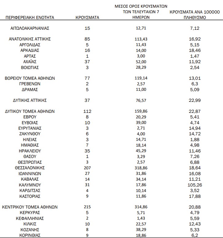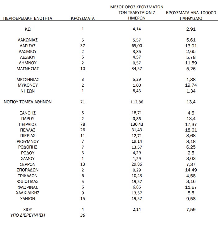 Επίσης, Αχαΐα και Λάρισα «δίνουν» από 37 κρούσματα, ενώ δύο λιγότερα, δηλαδή 35, το Ηράκλειο.