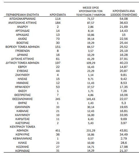 Με βάση τα επιβεβαιωμένα κρούσματα των τελευταίων 7 ημερών, 34 θεωρούνται σχετιζόμενα με ταξίδι από το εξωτερικό και 2.210 είναι σχετιζόμενα με ήδη γνωστό κρούσμα.