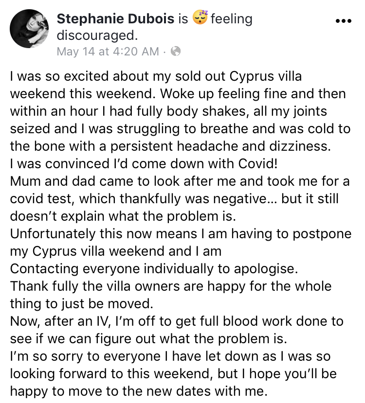Στις 6 Μαΐου η Stephanie είχε κάνει μια ανάρτηση στο Facebook λέγοντας πως είχε κάνει την πρώτη δόση του πειραματικού εμβολίου της AstraZeneca.