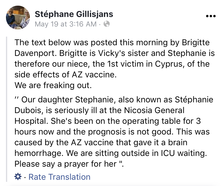 (Αρχικό κείμενο): Θρίλερ με το 39χρονο μοντέλο Stephanie Dubois, η οποία φέρεται να έχει χάσει τη ζωή του σε νοσοκομείο της Λευκωσίας μετά τον εμβολιασμό της με το σκεύασμα της AstraZeneca.
