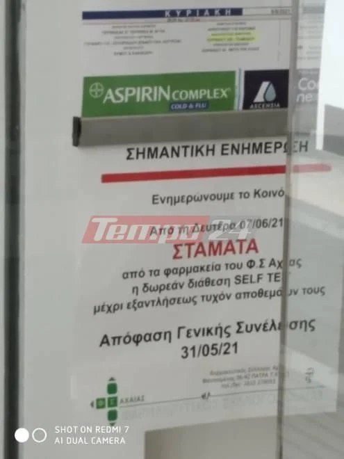 Μάλιστα, υπήρχε κολλημένη και ανακοίνωση που έγραφε: «Από τη Δευτέρα 7/6 σταματά από τα φαρμακεία του ΦΣ Αχαΐας η δωρεάν διάθεση Self Test μέχρι εξαντλήσεως τυχόν αποθεμάτων τους».