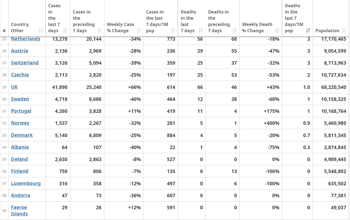 Και όλο αυτό ενώ η Ελλάδα είχε επί περίπου 6 μήνες το αυστηρότερο lockdown στην Ευρώπη, σύμφωνα με το Bloomberg, αντιθέτως στον πίνακα βλέπουμε στην Σουηδία η οποία ήταν μία από τις χώρες που δεν πήραν καθόλου μέτρα, βρίσκεται ανάμεσα στις καλύτερες χώρες, καθώς κατέγραψε μόλις 12 νεκρούς την τελευταία εβδομάδα (201 η Ελλάδα).