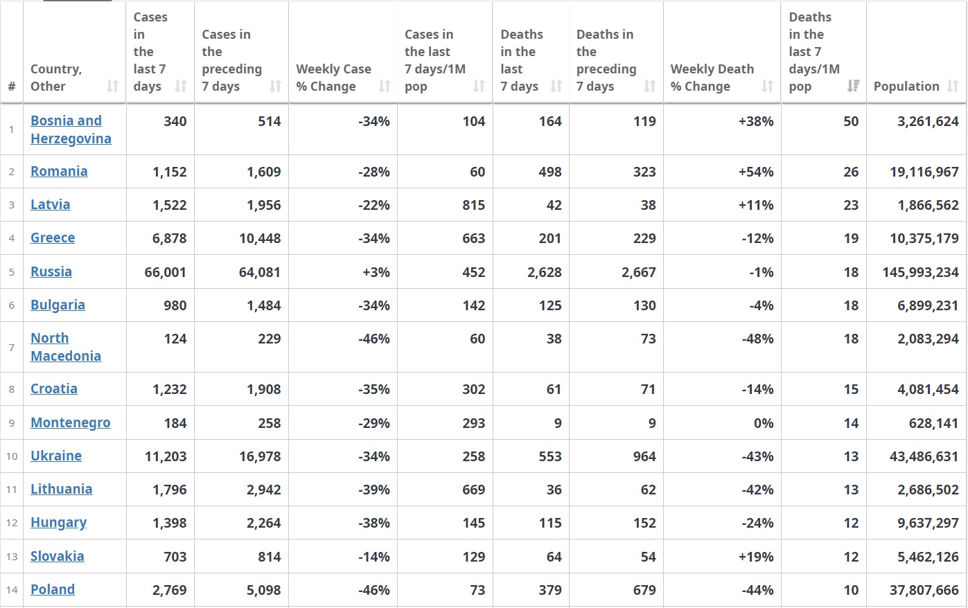 Αποκαλυπτικός είναι ο πίνακας του worldometers ο οποίος δείχνει πως η Ελλάδα είναι η 4η χειρότερη χώρα της Ευρώπης σε νεκρούς ανά εκατ. πληθυσμού την τελευταία εβδομάδα. Σε χειρότερη θέση από την Ελλάδα βρίσκονται: Βοσνία, Ρουμανία και Λετονία.