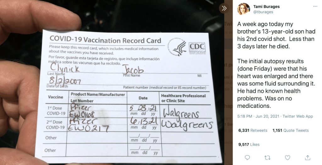 «Πριν μία βδομάδα, ο 13χρονος ανιψιός μου έκανε τη δεύτερη δόση του εμβολίου κατά της COVID-19. Μετά από 3 μέρες πέθανε. Τα πρώτα αποτελέσματα της αυτοψίας έδειξαν ότι η καρδιά του είχε πρηστεί και γέμισε υγρό. Δεν αντιμετώπιζε προβλήματα υγείας ούτε έπαιρνε φάρμακα».