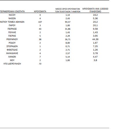 Στη Θεσσαλονίκη καταγράφηκαν 27 νέες μολύνσεις. Αξιοσημείωτο είναι ότι στο νομό Ηρακλείου Κρήτης εντοπίστηκαν 28 κρούσματα, ενώ στην περιφερειακή ενότητα Ρεθύμνου 38 κρούσματα.