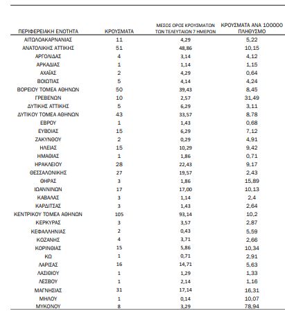Στη Θεσσαλονίκη καταγράφηκαν 27 νέες μολύνσεις. Αξιοσημείωτο είναι ότι στο νομό Ηρακλείου Κρήτης εντοπίστηκαν 28 κρούσματα, ενώ στην περιφερειακή ενότητα Ρεθύμνου 38 κρούσματα.