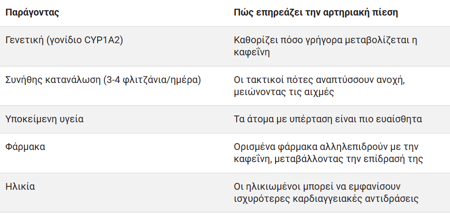 Η επίδραση του καφέ στην αρτηριακή πίεση εξαρτάται από διάφορους βιολογικούς παράγοντες και παράγοντες του τρόπου ζωής.