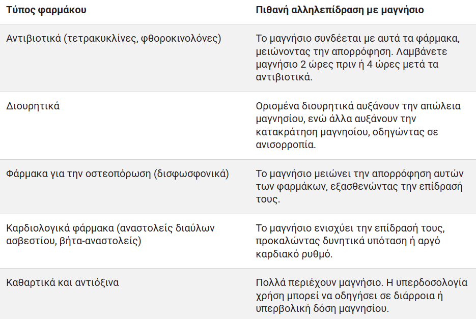 Το μαγνήσιο αλληλεπιδρά με πολλά φάρμακα, επηρεάζοντας την απορρόφηση και την αποτελεσματικότητά τους.