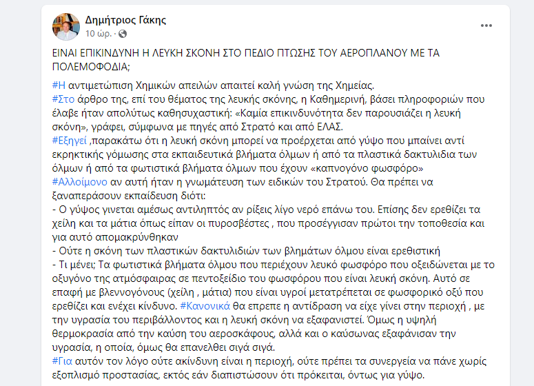 Ο γνωστός γενικός χειρουργός Δημήτρης Γάκης με ανάρτηση του στο Facebook αναφέρθηκε στην λευκή σκόνη που εμφανίστηκε μετά την πτώση του ουκρανικού Antonov έξω από την Καβάλα το βράδυ του Σαββάτου.
