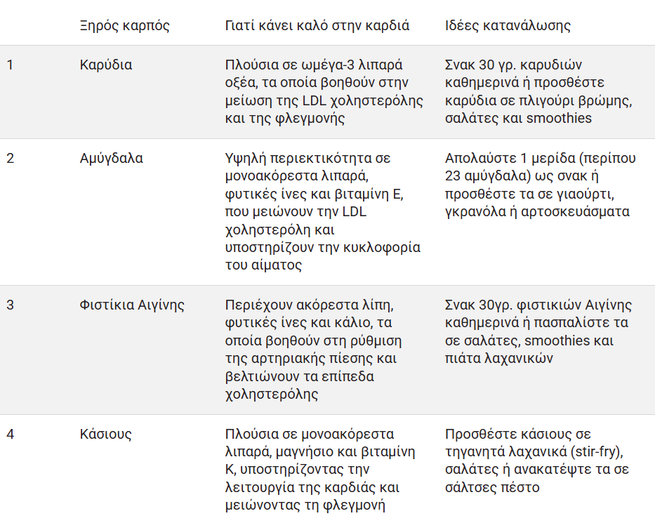 Από τα καρύδια και τα αμύγδαλα μέχρι τα φιστίκια Αιγίνης και τα καρύδια Βραζιλίας, κάθε είδος ξηρών καρπών προσφέρει μοναδικά οφέλη για τη βελτίωση των επιπέδων χοληστερόλης, της αρτηριακής πίεσης και της συνολικής καρδιακής λειτουργίας.