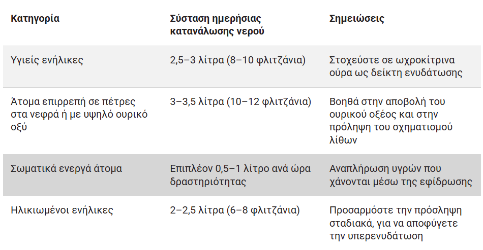 Δεν υπάρχει κάποια μοναδική ποσότητα που να κάνει για όλους: οι ανάγκες ενυδάτωσης εξαρτώνται από την ηλικία, το σωματικό βάρος, το επίπεδο δραστηριότητας και το κλίμα.