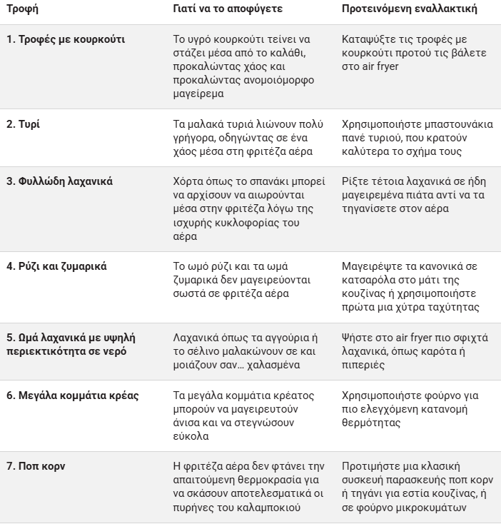 Τα air fryers είναι εξαιρετικά για μια ποικιλία φαγητών, αλλά δεν είναι όλες οι τροφές κατάλληλες για τηγάνισμα σε φριτέζα αέρος.