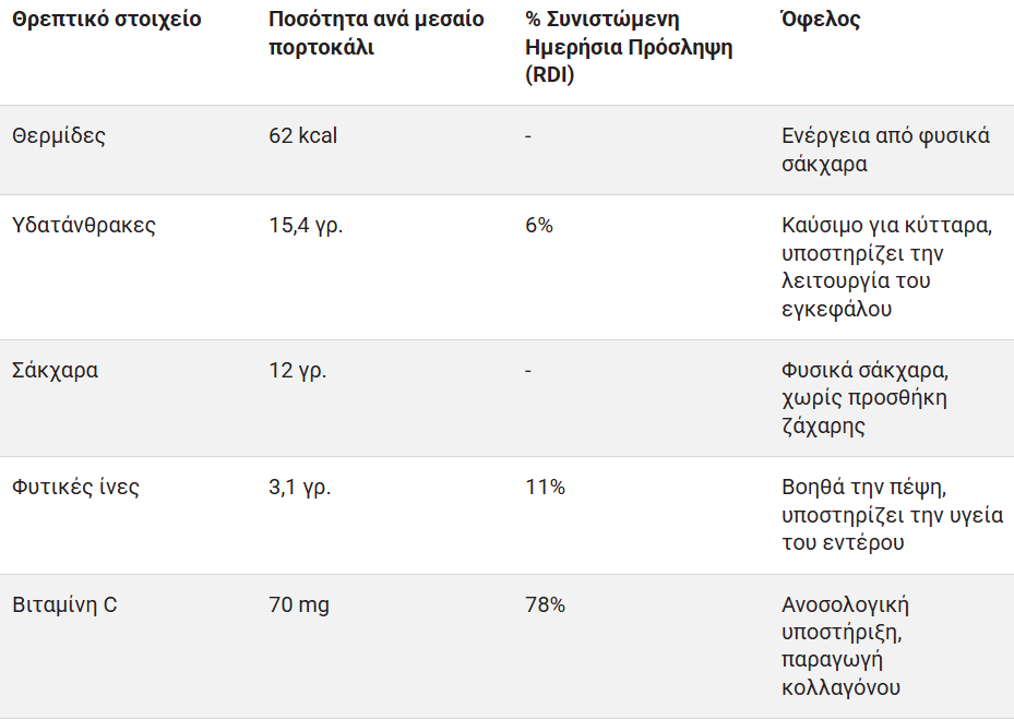 Ο παρακάτω πίνακας δείχνει το κατά προσέγγιση θρεπτικό περιεχόμενο ενός μεσαίου μεγέθους πορτοκαλιού (130 γραμμάρια):