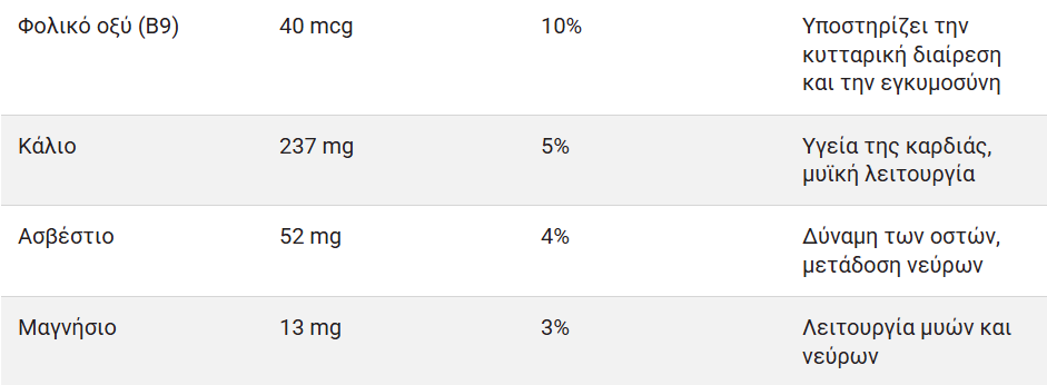 • Υγεία καρδιάς: Το κάλιο, οι φυτικές ίνες και τα φλαβονοειδή μπορεί να βοηθήσουν στην μείωση της αρτηριακής πίεσης και των επιπέδων χοληστερόλης