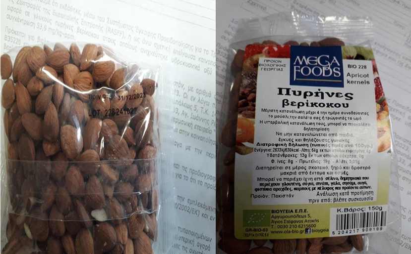 Για τη διακίνηση στην ελληνική αγορά από τη γερμανική εταιρεία «Bode Naturkost» πυρήνων βερίκοκου, προέλευσης Πακιστάν, στους οποίους ανιχνεύτηκε υδροκυανικό οξύ με υπέρβαση του νομοθετημένου ορίου ενημερώθηκε ο Ενιαίος Φορέας Ελέγχου Τροφίμων, μέσω του Συστήματος Έγκαιρης Προειδοποίησης για τα Τρόφιμα και τις Ζωοτροφές (RASFF).