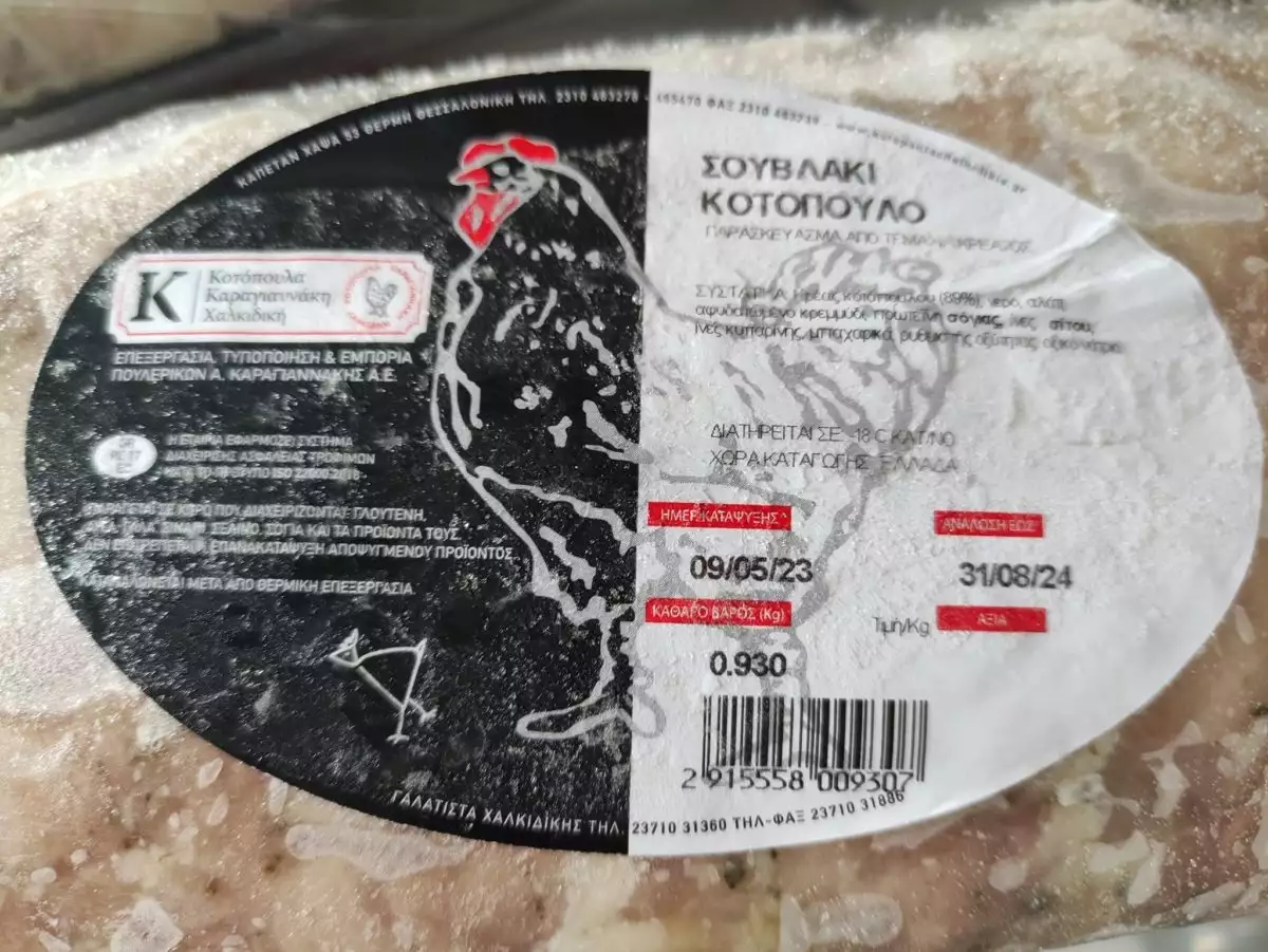 2) ΣΟΥΒΛΑΚΙ ΚΟΤΟΠΟΥΛΟ, με ημερομηνία ανάλωσης 31/08/2024 και ημερομηνία παραγωγής / κατάψυξης 09/05/2023