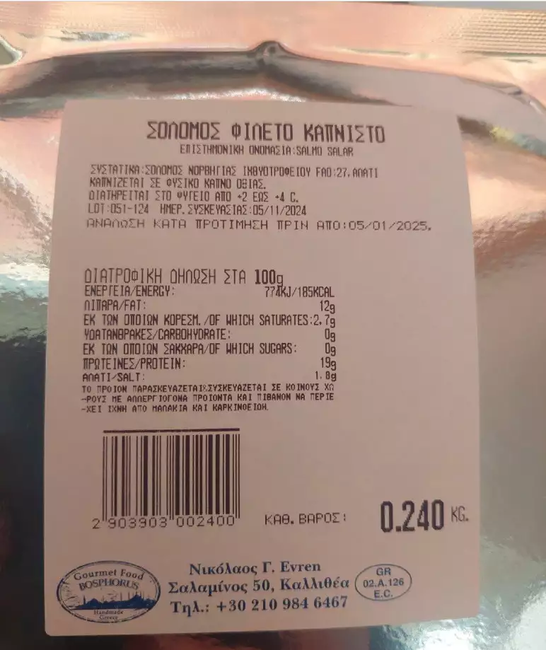 Συγκεκριμένα, πρόκειται για καπνιστό σολωμό φιλέτο με την εμπορική ονομασία «GOURMET FOOD BOSRHOROUS».