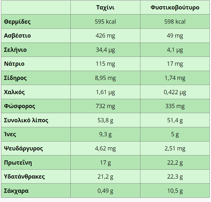 Το φυστικοβούτυρο κατασκευάζεται από άλεση φυστικιών και συχνά περιέχει προσθήκη ζάχαρης και ελαίων, ενώ το ταχίνι παρασκευάζεται από άλεση σησαμιού και συνήθως δεν περιλαμβάνει επιπλέον συστατικά.