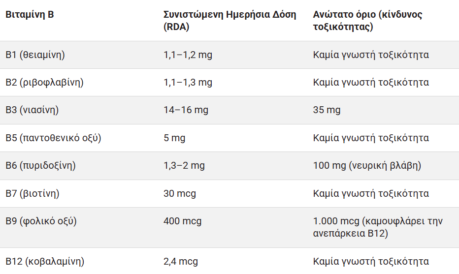 Για να αποφύγετε πιθανή τοξικότητα, ακολουθήστε τις συνιστώμενες ημερήσιες δόσεις (RDA) για κάθε βιταμίνη Β: