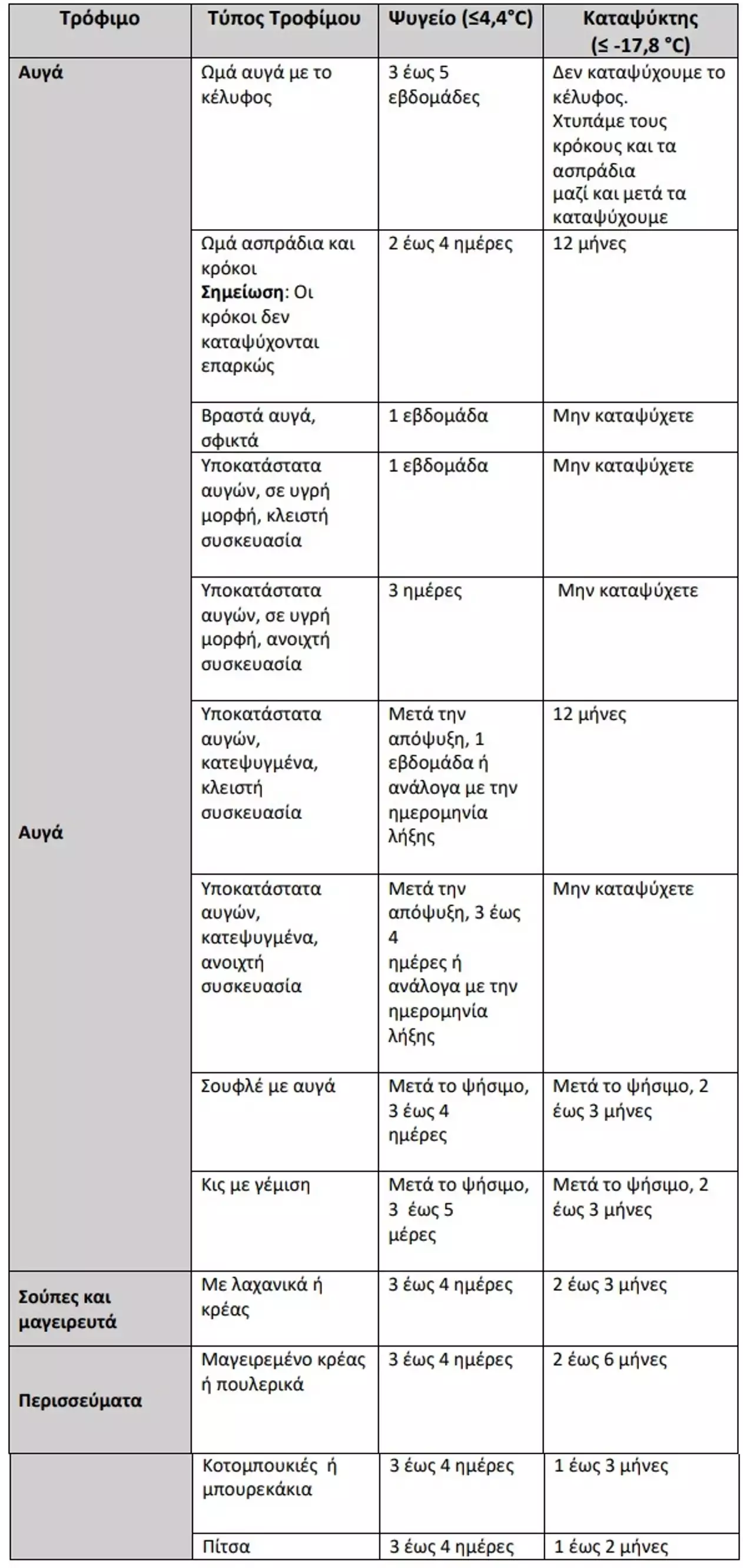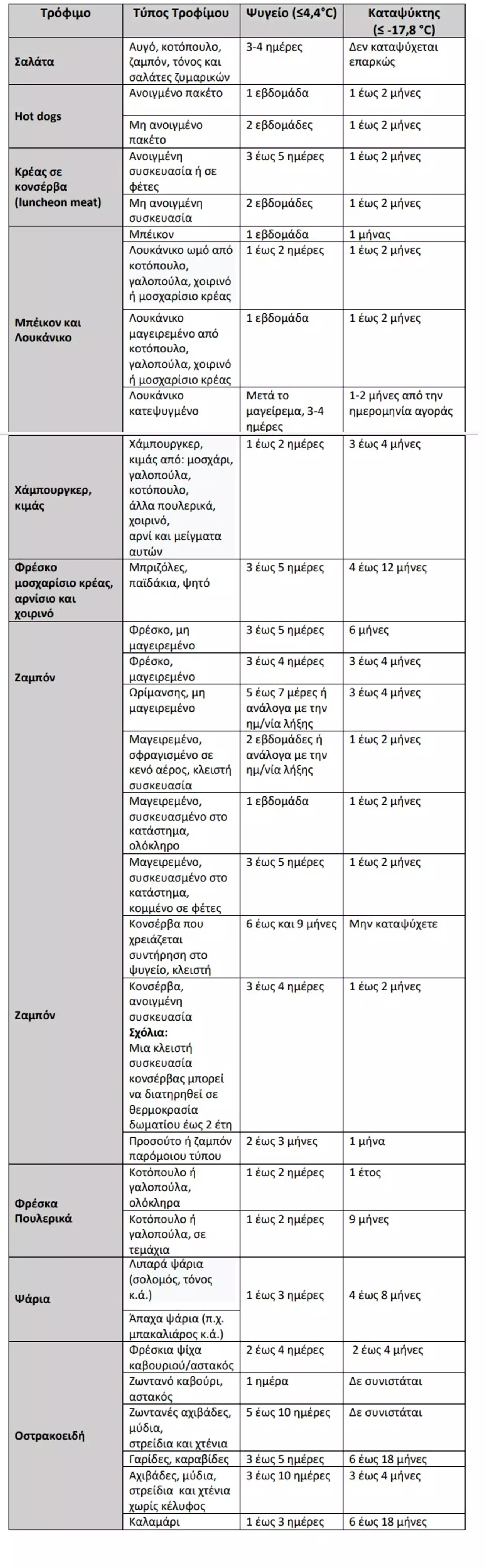Ο Εθνικός Οργανισμός Δημόσιας Υγείας (ΕΟΔΥ) δημοσίευσε προσφάτως αναλυτικό πίνακα με τους συνιστώμενους χρόνους συντήρησης διαφόρων τροφίμων στο ψυγείο ή/και στην κατάψυξη, ώστε να μπορούν να καταναλωθούν με ασφάλεια.