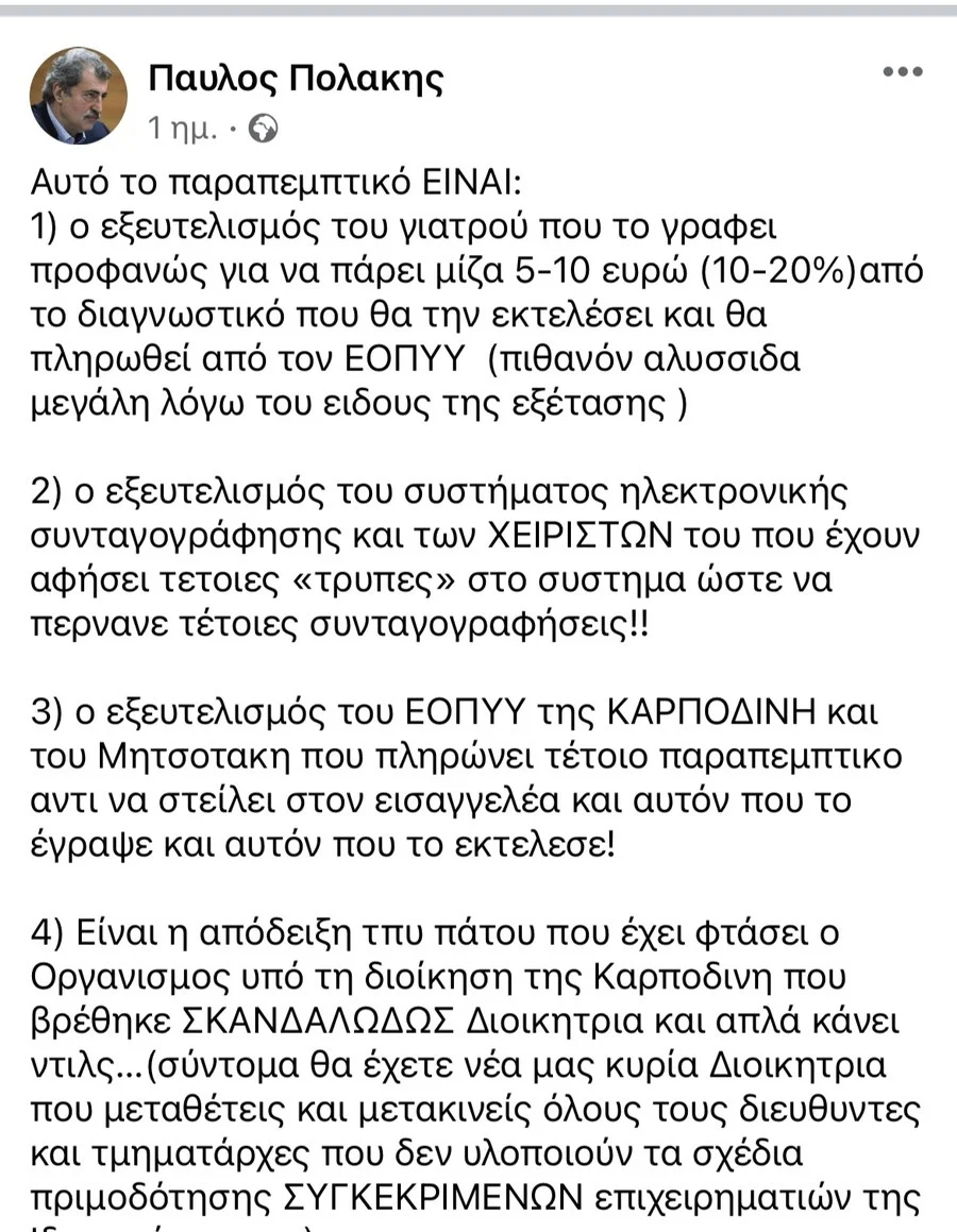 Να θυμίσουμε ότι ο Πολάκης στην ανάρτησή του στο facebook, που παρατίθεται παρακάτω, ασκεί δριμεία κριτική στον ΕΟΠΥΥ και τη διοικήτριά του, στην ΗΔΙΚΑ, στο γιατρό που έγραψε το συγκεκριμένο παραπεμπτικό, αλλά κι εν γένει στις πολιτικές των κυβερνήσεων Μητσοτάκη.