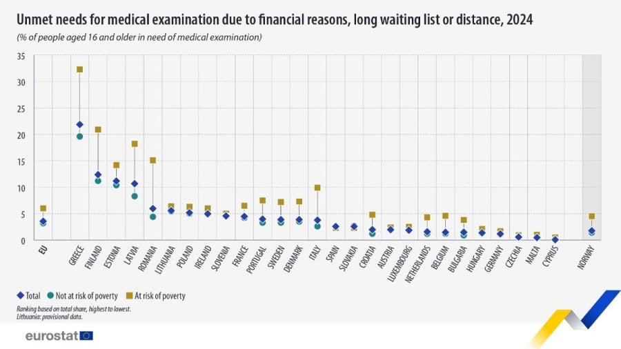 Αυτό σημαίνει ότι περισσότερο από το 32% των πολιτών που βρίσκονται σε κίνδυνο φτώχειας δήλωσαν πως δεν έλαβαν την αναγκαία ιατρική φροντίδα.