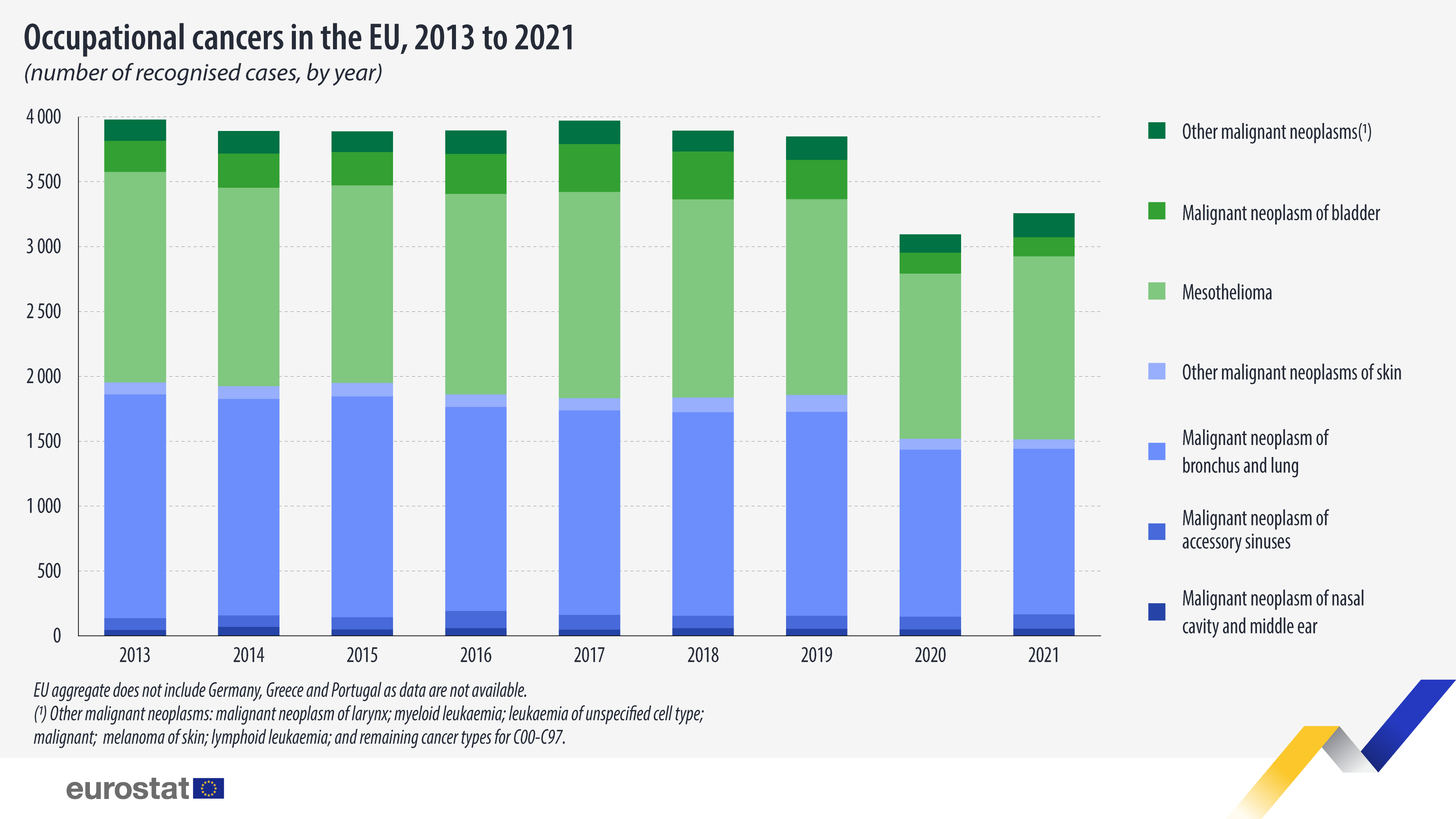 Όπως αναφέρει η Eurostat σε σημερινό της δημοσίευμα, μεταξύ 2013 και 2021 αναφέρθηκαν συνολικά 33.712 περιστατικά καρκίνου που σχετίζονταν με την επαγγελματική έκθεση.