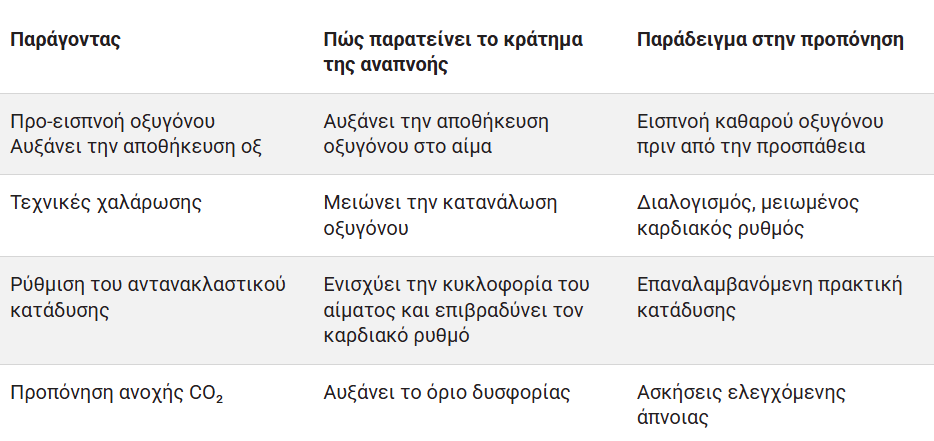 • Νοητικός αυτοέλεγχος: Η χαλάρωση και η μειωμένη ζήτηση οξυγόνου επιμηκύνουν την απόδοση.