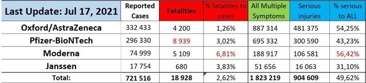 Η νέα έκθεση της EudraVigilance, την οποία επικαλείται το vaccineimpact.com, αναφέρει πως έχουν πεθάνει 18.928 άνθρωποι στην ΕΕ μετά τον εμβολιασμό τους κατά του κορωνοϊού και έχουν καταγραφεί 1.823.219 παρενέργειες. Τα στοιχεία αφορούν τα όσα έχουν καταγραφεί μέχρι τις 17 Ιουλίου 2021.
