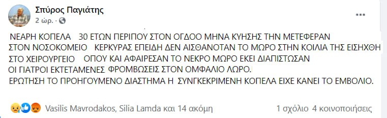 Σύμφωνα με ανάρτηση στο διαδίκτυο η 30χρονη κοπέλα έκανε το εμβόλιο στον 8ο μήνα της εγκυμοσύνη της με αποτέλεσμα να παρουσιάσει θρόμβωση στη κοιλιά με αποτέλεσμα το έμβρυο να πεθάνει και να αναγκαστούν να χειρουργήσουν την γυναίκα για να το βγάλουν από μέσα της!
