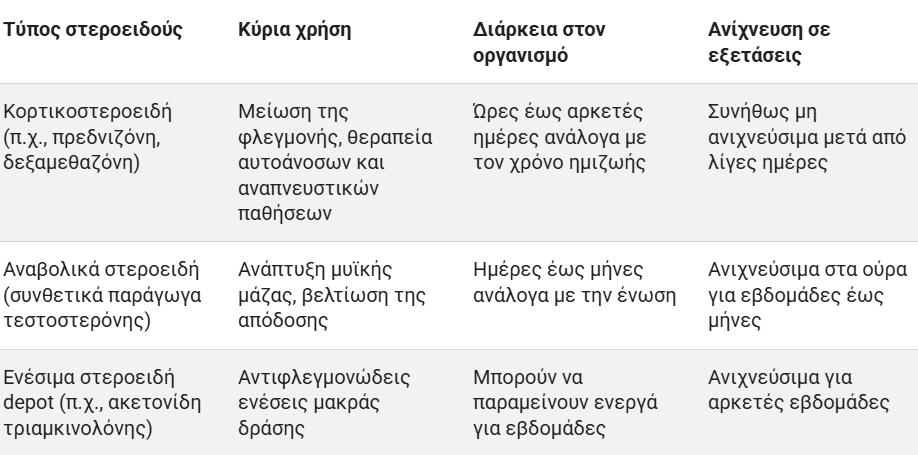 Γενικά, τα κορτικοστεροειδή -όπως η πρεδνιζόνη- μπορεί να απομακρυνθούν μέσα σε ώρες έως ημέρες, ενώ τα αναβολικά στεροειδή -που χρησιμοποιούνται για τη βελτίωση της απόδοσης- μπορούν να παραμείνουν ανιχνεύσιμα για εβδομάδες ή και μήνες.